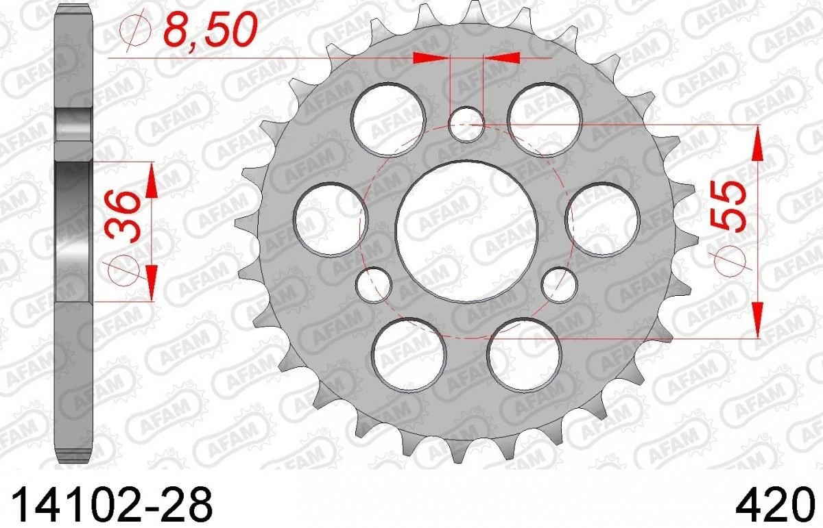 Een stalen 28 tands AFAM achtertandwiel. De tandwielen van AFAM zijn gemaakt van C45 staal met inductie geharde tanden, het tandprofiel is concentrisch, plat en perfect rond. Door deze samenstelling zijn de AFAM tandwielen perfect ter vervanging of zelfs ter verbetering van de OEM tandwielen.