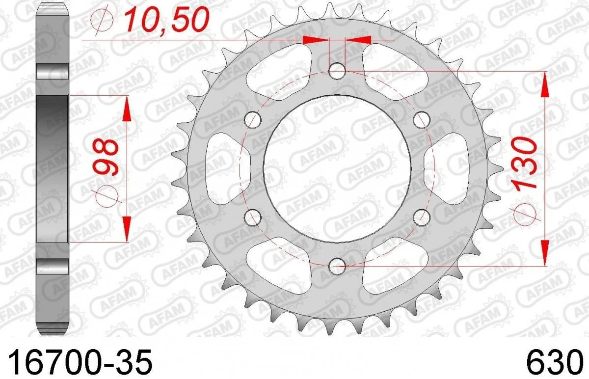 Een stalen 35 tands AFAM achtertandwiel. De tandwielen van AFAM zijn gemaakt van C45 staal met inductie geharde tanden, het tandprofiel is concentrisch, plat en perfect rond. Door deze samenstelling zijn de AFAM tandwielen perfect ter vervanging of zelfs ter verbetering van de OEM tandwielen.