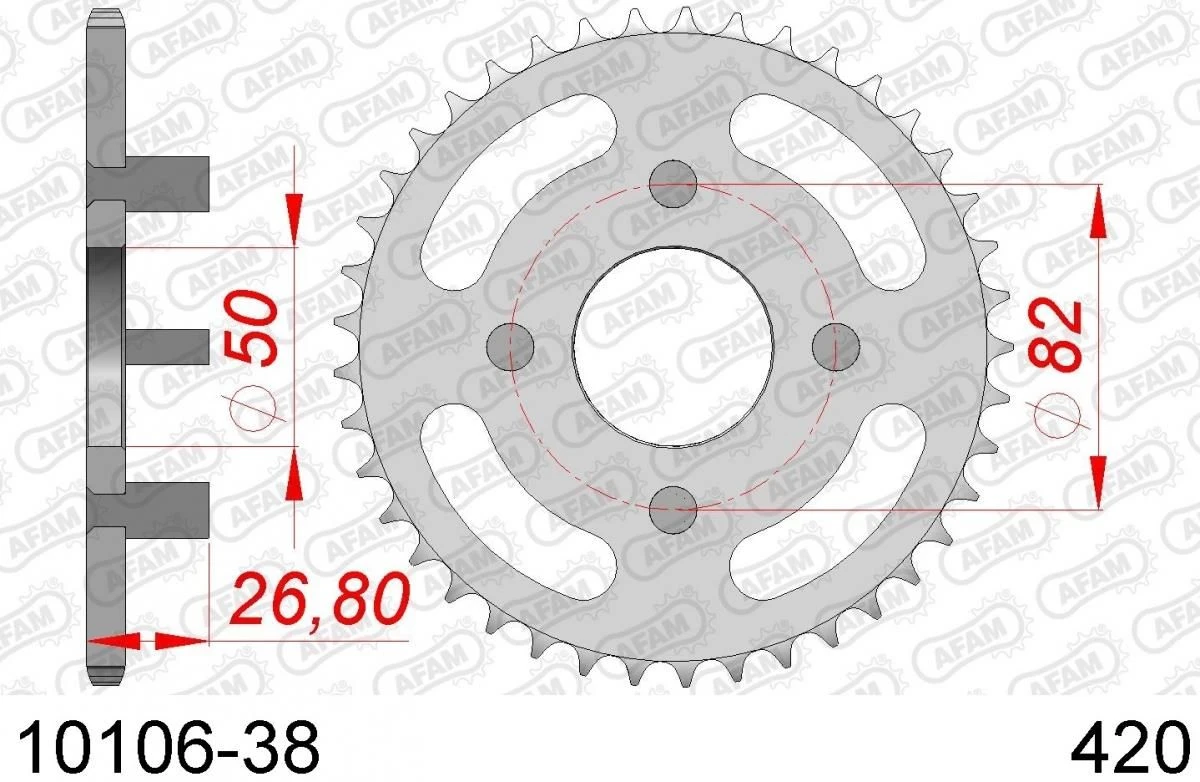 Een stalen 38 tands AFAM achtertandwiel. De tandwielen van AFAM zijn gemaakt van C45 staal met inductie geharde tanden, het tandprofiel is concentrisch, plat en perfect rond. Door deze samenstelling zijn de AFAM tandwielen perfect ter vervanging of zelfs ter verbetering van de OEM tandwielen.