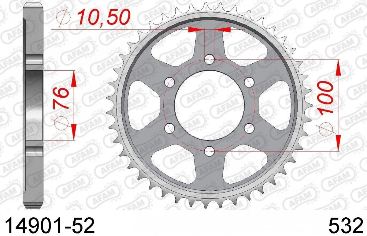 Een stalen 52 tands AFAM achtertandwiel. De tandwielen van AFAM zijn gemaakt van C45 staal met inductie geharde tanden, het tandprofiel is concentrisch, plat en perfect rond. Door deze samenstelling zijn de AFAM tandwielen perfect ter vervanging of zelfs ter verbetering van de OEM tandwielen.